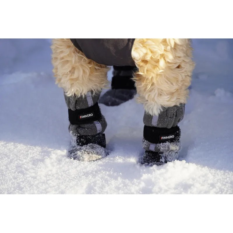 Finnero Halla Bootie är bekväma och funktionella hundskor som skyddar tassarna mot snö, kyla och frost. Varje sko har utrustats med en rejäl reflexremsa av hög kvalitet, för att synas ordentligt i mörkret. De är kända för goda passform och populära tack vare att det går upp en bit på benet.