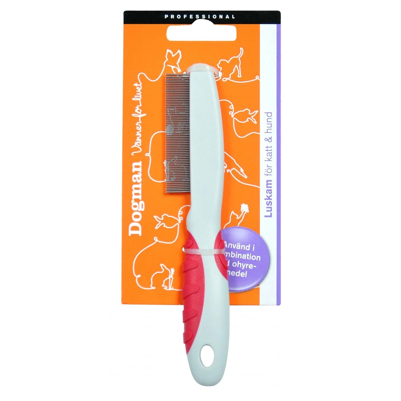 Effektiv metallkam för borttagning av löss, loppor och parasitägg ur pälsen. Den täta kammen är utrustad med fina, tättsittande tänder som noggrant fångar upp små parasiter och smuts utan att skada djurets hud. Perfekt för regelbunden pälsvård och kontroll av ohyra hos både katter och mindre hundar.